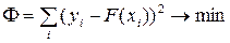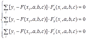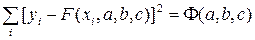 Пусть F(xi, a, b, c) = yi, i=1, 2,..., n. Сумма квадратов разностей соответствующих значений f и F будет иметь вид: