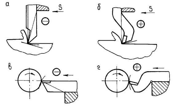 Для большинства случаев обработки определение упругих отжатий в технологической системе производится только под действием составляющей силы Ру. Это положение, однако, не является категоричным. Имеются примеры, когда и другие составляющие силы резаная (Рz и Рх) оказывают заметное влияние на величину упругих отжатий в интересующем нас направлении. С учетом составляющих Рz и Рх связано понятие "положительная" и "отрицательная" жесткости и "бесконечно большая жесткость". Положительной считают жесткость тогда, когда деформации системы способствуют отходу лезвия инструмента от обрабатываемой поверхности. Отрицательная жесткость соответствует случаю, когда деформации системы способствуют внедрению лезвия инструмента в материал заготовки. Например, при строгании глубоких пазов (рис. 10.4,а) изгиб державки вызывает увеличение глубины резания, которое в свою очередь приводит к увеличению усилий резания и деформации. В результате или произойдет поломка инструмента, или начнутся вибрации, ухудшающие качество обработанной поверхности. Для того, чтобы улучшить условия обработки, применяют изогнутые резцы, обеспечивающие положительную жесткость системы (рис. 10.4,б). Аналогично поступают при отрезке заготовок на токарных станках (рис. 10.4, в, г).