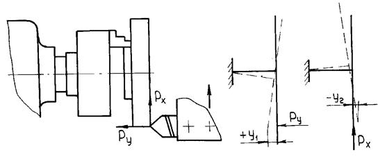 Рис.10.4. Положительная и отрицательная жесткость при строгальных (а, б) и токарных (в, г) работах Понятие "бесконечно большая жесткость" обычно связывают с торцевым точением (рис. 10.5). Она имеет место в случае, когда под действием сил Рх и Ру вызываемые ими деформации равны, но противоположны по направлению, т.е. суммарная деформация системы равна нулю.