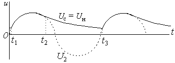 Конденсатор заряжается до напряжения U2, когда U2 > Uс (интервал t1 – t2). В течение интервала времени (t2 – t3) напряжение Uс> U2 – диод закрыт, а конденсатор разряжается через резистор Rн с постоянной времени .