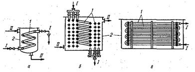 Рис. 20. Аппараты с погружными теплообменниками: а - с одним спиральным змеевиком; б - с несколькими спиральными змеевиками; в -с прямыми трубами; 1 - погружные трубы; 2 - корпуса; I и II – теплоносители.
