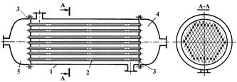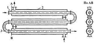 Рис. 22. Теплообменники типа «труба в трубе»: 1 – внутренняя труба; 2 - внешняя труба; 3 – колено. Кожухотрубчатые теплообменники. Они достаточно просты в изготовлении, отличаются возможностью развивать большую поверхность теплообмена в одном аппарате, надежны в работе. Простейшей конструкцией аппаратов такого типа являются кожухотрубчатый теплообменник (рис. 22). В кожухе 1 размещен трубный пучок, теплообменные трубы 2 которого развальцованы в трубных решетках 3. Трубная решетка жестко соединена с кожухом. С торцов кожух аппарата закрыт распределительными камерами 4 и 5. Кожух и камеры соединены фланцами.