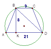 Основания равнобедренной трапеции равны 9 и 21, а высота равна 8. Найдите радиус окружности, описанной около трапеции.