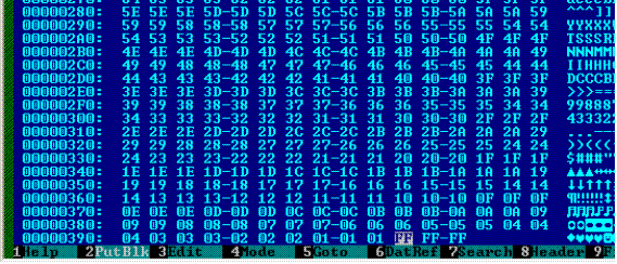 Рис.20. Удаление из таблицы цветов файла BMP с индексированными цветами 8-бит, черного цвета. В показанном выше примере в таблице цветов коды 00 в позициях 036-039 были заменены на FF, что привело к удалению из файла черного цвета и исчезновению черных квадратиков в углах изображения