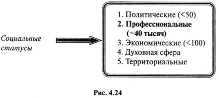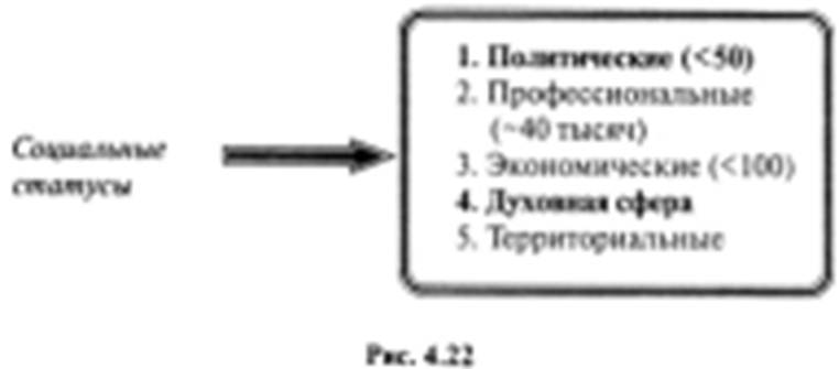 Анализ «сферной» совместимости показывает, что статус «Министр» принадлежит к социальной группе: главным кри терием принадлежности индивида к статусу «Министр» явля ется назначение на один из высших государственных постов. Статус «Рыбак» относится к группе социальных статусов (главным критерием принадлежности к этому статусу являет ся профессия). Статус «Коллекционер» относится к группе социальных статусов: главным критерием принадлежности к этому стату су определяется принадлежностью рода его деятельности к Духовной сфере (рис. 4.22).