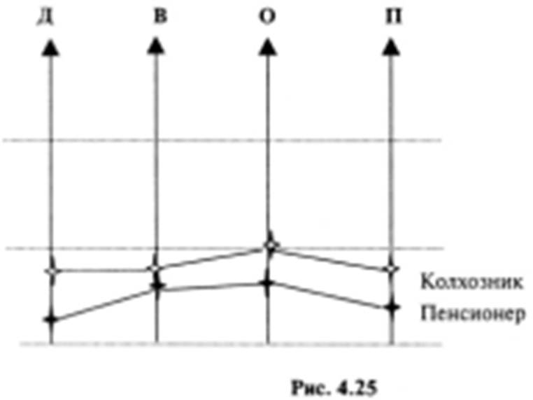 Из данной диаграммы видно, что стратификационные про филя лежат на разных уровнях, следовательно можно сделать вывод, что данные статусы несовместимы. «Сферная» совместимость. «Колхозник» – социальный ста тус: основным критерием принадлежности к этому статусу является профессия; «Горожанин» – социальный статус: ос новным критерием принадлежности к этому статусу является место его проживания; «Пенсионер» – социально-демогра фический статус: основным критерием принадлежности к это му статусу является возраст (рис. 4.26, рис. 4.27).