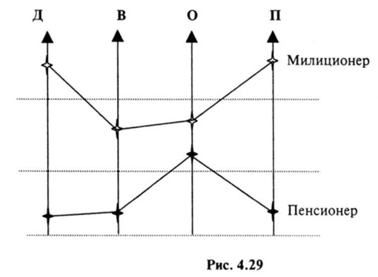 7. Милиционер, Пенсионер Рассмотрим стратификационную совместимость этих ста тусов. Для этого изобразим диаграмму стратификационных профилей (рис. 4.29).