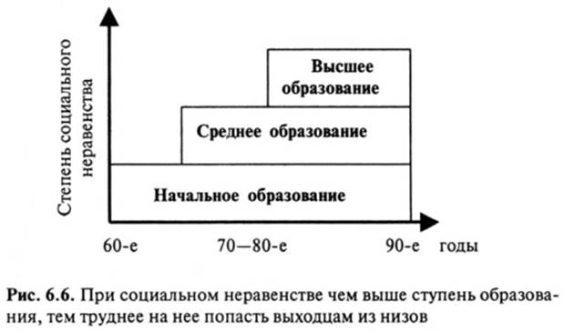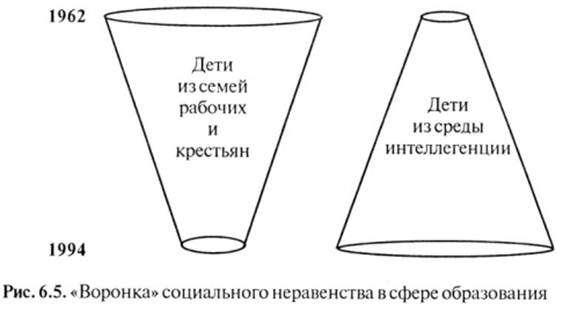 Дети руководителей и специалистов заполнили 75% вакансий самых престижных вузах, дети служащих – 13%, а дети рабочих и крестьян еще меньше (Там же. С. 113.). В 90-е годы качественное среднее и высшее образование становится все менее доступным для социальных низов. Плата за обучение в московских коммерческих лицеях и вузах достигает 2–4 тысяч долларов, в то время как средняя заработная плата москвича в месяц не составляет и 120 долларов. Очевидно, что попасть в престижные вузы имеют значительно больше шансов тот, чьи родители могут заплатить за учебу в привилегированной школе, за предварительную довузовскую подготовку, за обучение в вузе. В результате усиления социальной дифференциации дети – выходцы из низов вытесняются в «дешевые» школы, и происходит понижение уровня образования таких подростков. Через школьное и вузовское сито проходят главным образом дети из высших социальных слоев. О неравном доступе к получению образования на послешкольном и вузовском уровнях для рабочих и крестьян пишут и другие ученые: «В вузах, как правило, обучались сыновья и дочери партийных работников и интеллигенции, эти слои использовали свое влияние, для того чтобы обеспечить место своим детям в элитной общеобразовательной средней школе или университете... Еще один источник неравенства состоял в том, что социалистическая система образования и подготовки кадров, как правило, не принимала в расчет детей, имеющих специфические потребности. Дети-инвалиды, дети, отстающие в развитии или живущие в неблагоприятных социальных условиях, редко получали необходимую им специализированную помощь». Исследования, проведенные в Нижнем Тагиле показали, что оценка успеваемости и отсев среди школьников и учащихся профтехучилищ за время учебы происходят, намеренно или нет, по социально-классовому признаку: после восьмого класса больше отсеивают детей рабочих, нежели детей специалистов и служащих. Несколько позже аналогичные результаты дало обследование учащихся шести регионов страны, проведенное под руководством М. Н. Руткевича и Ф. Р. Филиппова. Выявилось неравномерное распределение молодых учителей, выпускников университетов и педагогических институтов, между школами города и села. Оказалось также, что значительная часть этих специалистов оседает в крупных городах, где они учились, и что многие из них недолго работают в сельской местности, особенно в восточных странах. Все это сказывалось на уровне подготовки школьников и в конечном счете способствовало воспроизводству социальных различий в области образования (Там же. С. 43, 82.). Исследования Ф. Р. Филиппова обнаружили нарастающую феминизацию учительских кадров при неравном распределении юношей и девушек между различными формами среднего образования. В 90-е годы в России начинает формироваться новый социальный институт – негосударственное высшее образование. Обучение в негосударственных (коммерческих) вузах доступно сегодня в основном выходцам из семей предпринимателей, интеллигенции и служащих. Именно этот тип учебных заведений (а также привилегированные платные учебные группы и факультеты, прежде всего юридические и экономические) становится источником новой российской элиты (получающей более качественное и престижное образование). Таким образом, в результате исследований, проведенных отече