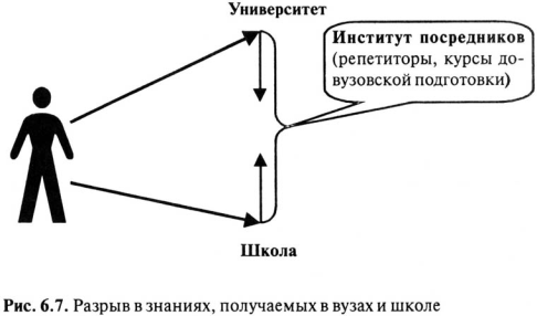 Институты-посредники подтягивают выпускников школ, чтобы ножницы разрыва между вузом и школой сомкнулись. Правда, сделать это с каждым годом становится, кажется, не легче, а сложнее. Как показывают социологические исследования и статистика, современная общеобразовательная школа не выполняет в полной мере ни одну из своих задач: возрастает уровень девиантного поведения несовершеннолетней молодежи, в том числе преступности, алкоголизма, наркомании, проституции и т.д. Школа не решает задачи профессионального самоопределения. Она неспособна подготовить абитуриентов к вступительным экзаменам в вуз. Функцию подготовки, которую должна выполнять средняя школа, активно реализуют неформальный институт репетиторства, многочисленные коммерческие курсы. В итоге, базируясь только на школьных знаниях в 1992–1997 годах в вузы поступило не более трети выпускников школ. Другая треть, чтобы поступить в вуз, вынуждена заниматься на подготовительных курсах, до 20% будущих абитуриентов нанимают репетиторов и примерно столько же готовятся самостоятельно. «Таким образом, в настоящее время подготовка молодежи в вузы более чем на 70% находится под контролем коммерческих структур, что в условиях экономического кризиса лишает значительную часть молодежи возможности получения высшего образования». Группа социологов и психологов под руководством В. Б. Ольшанского провела сравнительное исследование московских школьников в 1982 и 1997 гг. и выяснила, что если раньше переход из школы в вуз был естественной и непрерывной линией развития человека, то сегодня образовался разрыв между тем, что ученик изучал в школе, и тем, какие знания он должен продемонстрировать на вступительных экзаменах в институт. «Ощущая недостаток своей подготовки для поступления в вуз, школьник вынужден искать организации, где он мог бы получить необходимые для прохождения курса знания. Такие заведения есть, но они – платные, то есть недоступные для многих семей. Поступление в колледж тоже требует денег. Вместо здоровой конкуренции способностей возникает аукцион: кто сможет больше заплатить. А последнее зависит не от желания, а скорее от возможностей родителей». Согласно прогнозу, доля абитуриентов, поступающих в вуз только на базе школьных знаний, даже в XXI веке не превысит 40%, в связи с чем 60% выпускников средних школ будут вынуждены изыскивать дополнительные формы подготовки в вуз. Видимо, существует значительный разрыв в понимании базовых знаний между учителями средних школ и преподавателями вузов. Социологические данные показывают, что 42,2% преподавателей вузов в областных и республиканских центрах и 32,8% педагогов Москвы и Санкт-Петербурга отмечают резкое снижение в последние годы уровня подготовки абитуриентов к конкурсным экзаменам в вузы. Причем значительное снижение качества подготовки абитуриентов характерно для поступающих на все факультеты. Платные вузы чаще всего недоступны и рядовой российской интеллигенции из среднего класса. Но она, в отличие от представителей низшего класса, отсутствие денег способна компенсировать дополнительными знаниями, которые дают детям образованные родители. Если они сами не в состоянии дотянуть детишек до нужного вузу уровня подготовки, они прибегают к посредникам – репетиторам, курсам подготовки в вуз, подготовительным отде