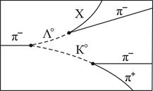 На рисунке показана фотография взаимодействия -мезона с протоном в водородной пузырьковой камере, которое идет по схеме