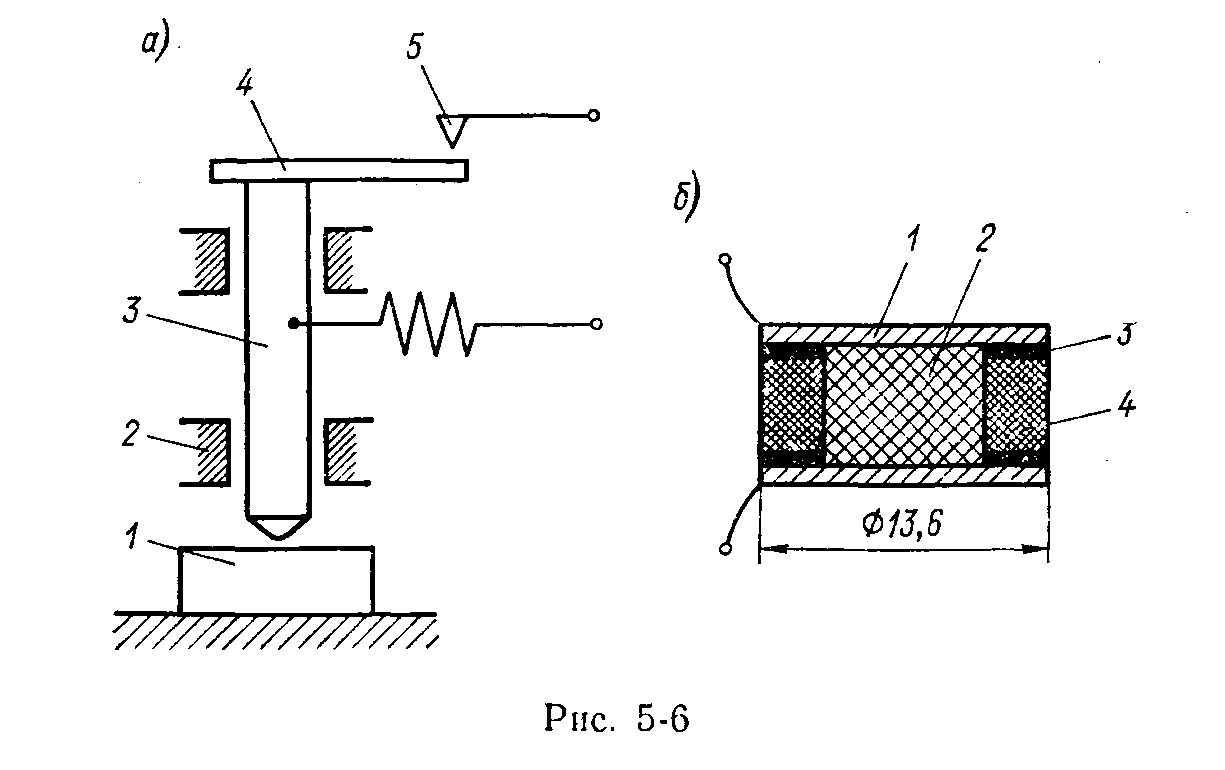Пример однопредельного контактного преобразователя приведен на рис. 5.13 и имеет пару контактов электромагнитного реле 4, 5, при замыкании которых происходит регистрация изделия 1. При попадании изделия под шток 3, он переместится в направляющих 2 и укрепленный на нем контакт 4 придет в соприкосновение с контактом 5, при этом сопротивление между контактами изменится от В обычных электромагнитных реле часто отказ возникает из-за контактов, которые подвергаются вредным воздействиям окружающей среды (окислению, загрязнению, коррозии и др.). Существенно повысить надежность реле можно за счет герметизации контактов. Так как в этом случае невозможно механически связать контактный узел с электромагнитным приводом, то необходимо для перемещения герметизированных контактов использовать силы электромагнитного притяжения. Контактные пластины для этого изготовляются из ферромагнитного материала. Таким образом, контакты становятся магнитоуправляемыми. К магнитоуправляемым контактам относятся герконы (т. е. герметизированные контакты). Применяются они для тех же целей, что и мощные электромагнитные реле. Они и возникли в результате совершенствования контактных электромагнитных устройств и стремления свести к минимуму их недостатки: сравнительно небольшой срок службы (до 107 срабатываний), невысокое быстродействие (десятки миллисекунд), потребление энергии в течение всего периода притяжения якоря и необходимость периодического обслуживания. Геркон (рис. 5.14, а)представляет собой впаянные в стеклянную ампулу (баллон), имеющую диаметр 3 мм, длину до 20 мм, пермаллоевые контактные пластины 1, которые одновременно являются токоподводами, контактами и магнитопроводом. Пластины впаяны в ампулу таким образом, чтобы контакты, в качестве которых используются внутренние концы пластин, покрытые золотом, радием или вольфрамом, находились на некотором расстоянии друг от друга, т. е. были разомкнуты. Пластины деформируются под воздействием контактного поля, что приводит к замыканию контакта. Токи переключения составляют от
