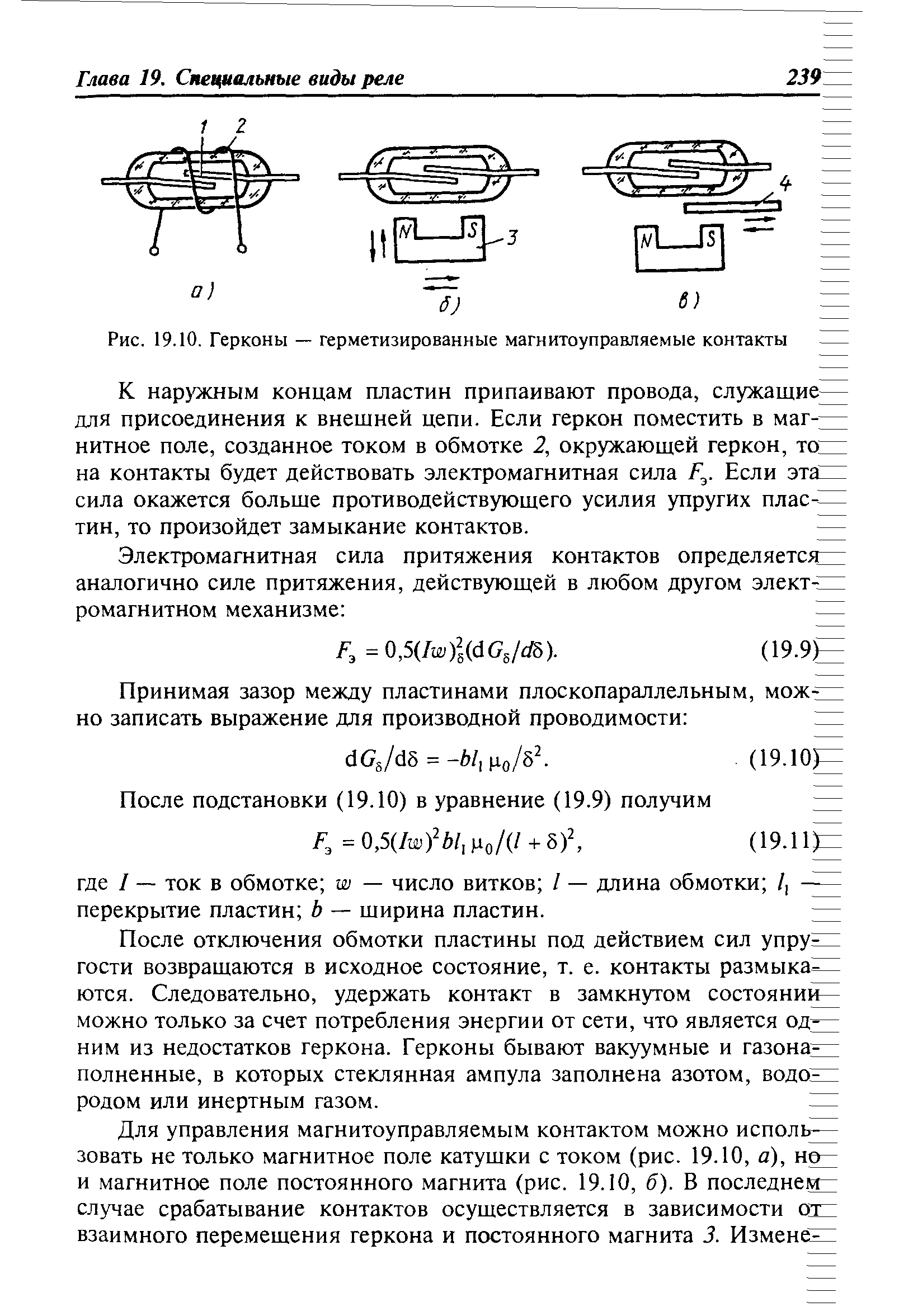 К наружным концам пластин припаивают провода, служащие для присоединения к внешней цепи. Если геркон поместить в магнитное поле, созданное током в обмотке 2,окружающей геркон, то на контакты будет действовать электромагнитная сила F э. Если эта сила окажется больше противодействующего усилия упругих пластин, то произойдет замыкание контактов. Электромагнитная сила притяжения контактов определяется аналогично силе притяжения, действующей в любом другом электромагнитном механизме: F э=0,5(I w)2 bl 1m0/(l +d)2, где I – ток в обмотке; w–число витков; l – длина обмотки; l 1 –перекрытие пластин; b – ширина пластин. После отключения обмотки пластины под действием сил упругости возвращаются в исходное состояние, т. е. контакты размыкаются. Следовательно, удержать контакт в замкнутом состоянии можно только за счет потребления энергии от сети, что является одним из недостатков геркона. Герконы бывают вакуумные и газонаполненные, в которых стеклянная ампула заполнена азотом, водородом или инертным газом. Для управления магнитоуправляемым контактом можно использовать не только магнитное поле катушки с током (рис. 5.14, а),но и магнитное поле постоянного магнита (рис. 5.14, б). В последнем случае срабатывание контактов осуществляется в зависимости от взаимного перемещения геркона и постоянного магнита 3. Изменение магнитного поля, воздействующего на контакты, может осуществляться и за счет изменения параметров магнитной цепи при перемещении ферромагнитного экрана 4 (рис. 5.14, в). Большая часть управляющего магнитного потока во всех схемах герконов, изображенных на рис. 5.14, проходит по воздуху. Так как воздушные участки имеют значительное магнитное сопротивление, то чувствительность устройств на герконах сравнительно невелика. Она, например, ниже чувствительности якорных электромагнитных реле с одинаковыми коммутационными параметрами. Для повышения чувствительности используют герконы с внешним магнитопроводом (рис. 5.15). Наличие внешнего магнитопровода увеличивает магнитную проводимость и, следовательно, индуктивность и инерционность всей системы. Постоянная времени при этом возрастает пропорционально индуктивности. Комбинированная конструкция, объединяющая магнитоуправляемые контакты и внешний магнитопровод, называется ферридом. Название «феррид» объясняется тем, что первоначально эти элементы имели магнитопровод из феррита. Затем появились конструкции и с металлическим магнитопроводом. Так как материал магнитопровода имеет остаточную намагниченность, то феррид после отключения запоминает воспринятую информацию.