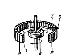 2. Преобразователи контактного сопротивления (рис. 5.16) основаны на изменении под действием давления сопротивления между проводящими элементами, разделенными слоями полупроводящего материала. Преобразователь выполняют в виде столбика из ряда слоев электропроводящей бумаги, электропроводящей резины (металлических пластин с напыленным высокоомным резистивным слоем) 2. Преобразователи контактного сопротивления имеют большие погрешности гистерезиса и линейности до 10%, но просты конструктивно и имеют достаточно высокую выходную мощность и надежность. Подобные датчики используются в тактильных датчиках роботов и манипуляторов, а также в диэлектрических протезах. 3. Реостатные преобразователи. Реостатный преобразователь–это прецизионный реостат, движок которого перемещается под действием измеряемой величины, примеры реализации которого – измерение углового и линейного перемещения. Естественной входной величиной преобразователя является перемещение движка, а выходной – сопротивление. На рис. 5.17 приведена конструкция потенциометрического датчика для измерения угловых перемещений. Так же как и датчик линейных перемещений, он состоит из каркаса 1 с обмоткой 2,по которой скользит движок 3. Для съема сигнала с перемещающегося движка служит добавочная щетка 4,скользящая по токосъемному кольцу 5.Выходное напряжение датчика угловых перемещений пропорционально углу поворота подвижной части первичного измерителя, соединенного с осью движка.