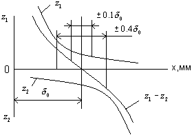 где Благодаря использованию этих цепей уменьшается аддитивная погрешность, улучшается линейность функции преобразования, в 2 раза возрастает чувствительность и уменьшается сила притяжения якоря. Графики изменения комплексных сопротивлений z1 и z2 катушек w 1 и w 2 дифференциального индуктивного преобразователя от перемещения х представлены на рис. 5.44. На этом же рисунке изображена функция, характеризующая закономерность изменения разности z 1- z2 от измеряемого перемещения x. Из приведенного графика следует, что зависимость z 1–z2=j(x) имеет более линейный характер, чем каждая из функции z 1=j(x) и z2=j(x). Поэтому при той же допустимой погрешности аппроксимации функции преобразования (~1%), что и в обычном индуктивном преобразователе, рабочий диапазон дифференциального преобразователя расширяется примерно в 4 раза (рис. 5.44): с Погрешность индуктивных преобразователей. Температурная погрешность индуктивных преобразователей в основном обусловлена изменением активной составляющей их сопротивления. Эта погрешность аддитивна и уменьшается при применении мостовых схем. Кроме того, при изменении температуры изменяется магнитная проницаемость стали, что приводит к некоторому дополнительному изменению аддитивной и мультипликативной погрешностей. При изменении напряжения питания меняется магнитная проницаемость магнитопровода преобразователя, а следовательно, его сопротивление и чувствительность. Изменяется также чувствительность мостовой измерительной цепи. Изменение сопротивления приводит к аддитивной погрешности и компенсируется мостовой цепью. Изменение чувствительности создает мультипликативную погрешность. Для ее уменьшения либо стабилизируют напряжение источника питания моста, либо применяют компенсационные схемы измерения. Изменение частоты питающего напряжения приводит к изменению сопротивления резисторов, включенных в мост, и меняет чувствительность. Малую погрешность имеют мостовые схемы (рис. 5.43), у которых чувствительность в режиме холостого хода S сх х не зависит от параметров цепи. У других схем для уменьшения погрешности нужно стабилизировать частоту питающего напряжения. При перемещении якоря преобразователя изменяется выходное напряжение моста. При среднем положении якоря должно быть U вых=0. Однако практически имеется небольшое напряжение, что приводит к аддитивной погрешности измерительного моста. Для балансировки мостов переменного тока необходима раздельная регулировка действительной и мнимой составляющих его выходного напряжения. В мостах с индуктивными преобразователями одна составляющая регулируется перемещением якоря преобразователя, другая – путем регулировки других сопротивлений (например, сопротивлений z 3 или z 4 в схеме рис. 5.43, б). Если регулировка сделана недостаточно тщательно, то изменением положения якоря нельзя полностью сбалансировать схему. Другая причина погрешности моста заключается в том, что в питающем напряжении помимо напряжения с основной частотой имеются составляющие с кратными частотами и с частотой промышленной сети. Реальный мост переменного тока, питающийся таким напряжением, полностью сбалансировать трудно вследствие наличия несбалансированных составляющих с частотами, отличными от основной. Конструкция. Конструкция преобразователя определяется г