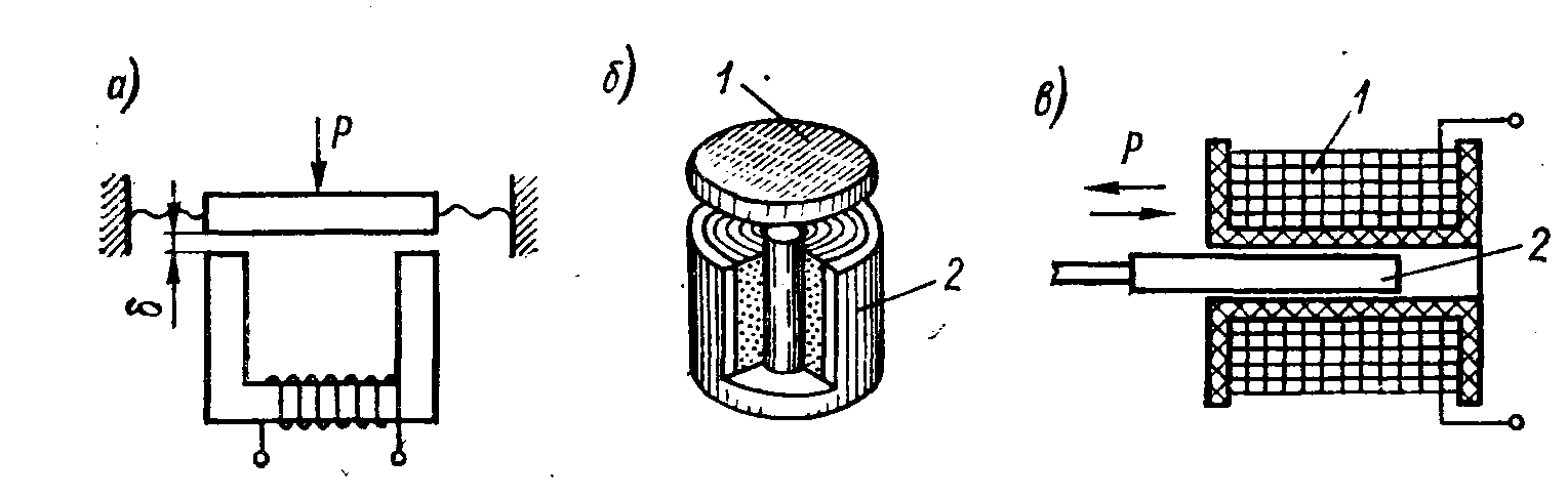 Другая модификация индуктивных датчиков, которую применяют для измерения больших перемещений, в виде катушки с подвижным внутренним сердечником (плунжерный преобразователь) показана на рис. 5.46. Преобразователь представляет собой катушку 1,из которой может выдвигаться ферромагнитный сердечник 2 (плунжер). Если сердечник полностью введен внутри катушки, на которую намотана обмотка, то ее индуктивное сопротивление максимально, а ток в обмотке имеет минимальное значение. При выводе сердечника из катушки индуктивное сопротивление уменьшается, а ток соответственно увеличивается. Этот тип преобразователя применяется для измерений значительных перемещений сердечника (от 10 до 100 мм). Их также называют индуктивными датчиками с разомкнутым магнитопроводом, поскольку даже при максимальной индуктивности обмотки основной путь магнитный поток проходит по воздуху. С этой точки зрения рассмотренные выше датчики с обмоткой на неподвижном сердечнике и с перемещающимся якорем (рис. 5.45) называют индуктивными датчиками с замкнутым магнитопроводом. У плунжерных датчиков есть одна очень важная особенность: они позволяют получить информацию о перемещении из замкнутого, изолированного пространства. Пусть, например, надо измерить уровень какой-либо очень вредной жидкости, пары которой ядовиты, да еще находятся под большим давлением. Тогда катушку 1 плунжерного датчика (рис. 5.46) надевают на разделительную трубку 3из нержавеющей немагнитной стали, внутри которой и перемещается сердечник 2из ферромагнитного материала. Перемещение сердечника изменяет индуктивность катушки, а разделительная трубка не экранирует магнитное поле, поскольку материал трубки имеет очень малую магнитную проницаемость. Таким образом, обмотка датчика, все другие электрические элементы измерительной схемы размещены в обычных, нормальных условиях. В связи с этим про плунжерные датчики говорят, что они позволяют вывести перемещение из замкнутого объема. В этом основное преимущество плунжерных датчиков перед датчиками с замкнутым магнитопроводом. А вот по чувствительности, мощности выходного сигнала плунжерные датчики уступают индуктивным датчикам с замкнутым магнитопроводом. С помощью плунжерных датчиков могут быть реализованы такие же дифференциальные и мостовые схемы, какие были рассмотрены. На рис. 5.47 схематически показаны конструкции различных типов индуктивных преобразователей. Индуктивный преобразователь (рис. 5.47, а) с переменной длиной воздушного зазора δ характеризуется нелинейной зависимостью L = f (δ). Такой преобразователь применяется при перемещениях якоря на расстояние 0,01 – 5 мм. Значительно меньшей чувствительностью, но линейной зависимостью L = f (δ)отличаются преобразователи с переменным сечением воздушного зазора (рис. 5.47, б). Эти преобразователи используются при перемещениях якоря до 10– 15 мм.