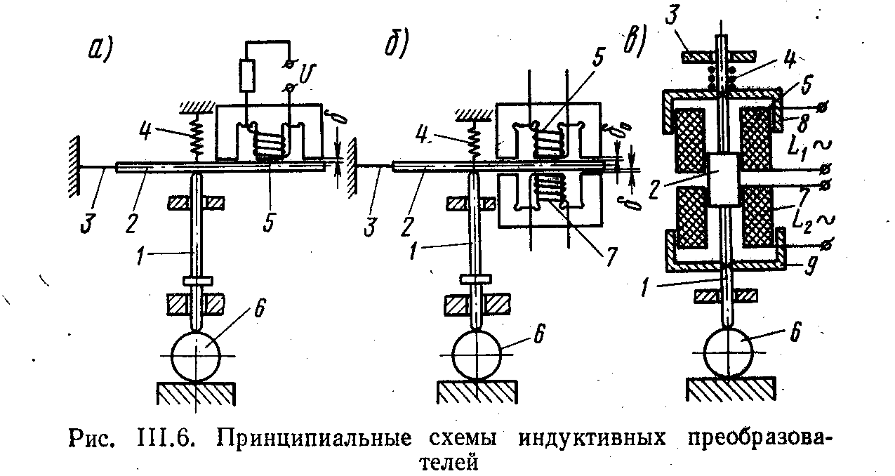 В индуктивных дифференциальных преобразователях (рис. 5.47, б) под воздействием измеряемой величины одновременно и притом с разными знаками изменяются два зазора двух электромагнитов. Верхний торец измерительного стержня 1 воздействует на якорь 2, подвешенный на плоской пружине 3. Изменение положения якоря, определяемое размером контролируемой детали 6, вызовет изменение воздушного зазора между якорем 2 и катушкой 5 простого датчика или перераспределение воздушного зазора между катушками 5 и 7 и якорем 2 дифференциального датчика. При уменьшении зазора между якорем и катушкой 5 зазор между якорем и катушкой 7 увеличивается. Изменяется одновременно индуктивность обеих катушек, поэтому чувствительность дифференциального датчика вдвое выше, чем простого. Измерительное усилие создается пружиной 4. На рис. 5.47, в изображена принципиальная схема дифференциального индуктивного датчика плунжерного типа с экранирующими кольцами. На измерительном стержне 1 датчика, перемещающемся в направляющих 3, закреплены ферритовый якорь 2 и два медных экранирующих кольца 8 и 9. Этот датчик обладает высокой чувствительностью, так как изменение индуктивности L 1 и L 2 обеих катушек зависит от совместного действия двух факторов: положений сердечника и колец. Датчик питается высокочастотным напряжением 50 – 100 кГц. Сила магнитного притяжения в простом датчике может быть значительной и измерительному стержню, перемещающему якорь, приходится ее преодолевать, что вызывает необходимость увеличения измерительного усилия и является одним из недостатков простого индуктивного датчика. В дифференциальном датчике результирующая сила магнитных притяжений якоря в воздушных промежутках со стороны электромагнитов уравновешивается, т.е. оказывается меньше, чем в недифференциальных, и измерительный стержень должен преодолевать лишь силу тяжести подвижной системы датчика и усилие в пружинном шарнире. Дифференциальные преобразователи в сочетании с соответствующей схемой (обычно мостовой) имеют более высокую чувствительность, чем обычные преобразователи, дают возможность уменьшить нелинейность функции преобразования, испытывают меньшее влияние внешних факторов. Индуктивные преобразователи используются для преобразования перемещения и других неэлектрических величин, которые могут быть преобразованы в перемещение (усилие, давление, момент и т. д.) и характеризуются простотой и надежностью в работе. По сравнению с другими преобразователями индуктивные преобразователи отличаются большой мощностью преобразователя 1 – 5 ватт, что позволяет использовать сравнительно малочувствительный указатель на выходе измерительной цепи. Недостатком их является наличие обратного воздействия преобразователя на измеряемый объект (воздействие электромагнита на якорь) и влияние инерции якоря на частотную характеристику прибора.