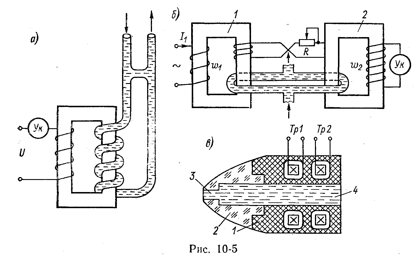 Для повышения стабильности преобразователя его электроды должны быть химически инертны по отношения к исследуемому раствору и выполняются из платины, нержавеющей стали или графита. Загрязнение электродов, изменение их активной площади вызывают погрешность. Более надежны бесконтактные электролитические преобразователи, токоведущие элементы которых изолированы от электролита, что исключает поляризацию и другие нежелательные взаимодействия электрода и раствора. Они разделяются на низкочастотные (f £40¸50 кГц) и высокочастотные. На рис. 5.88показан низкочастотный трансформаторный преобразователь с короткозамкнутой вторичной обмоткой. Изменение электропроводности раствора приводит к изменению сопротивления вторичной обмотки и, следовательно, сопротивления первичной обмотки.