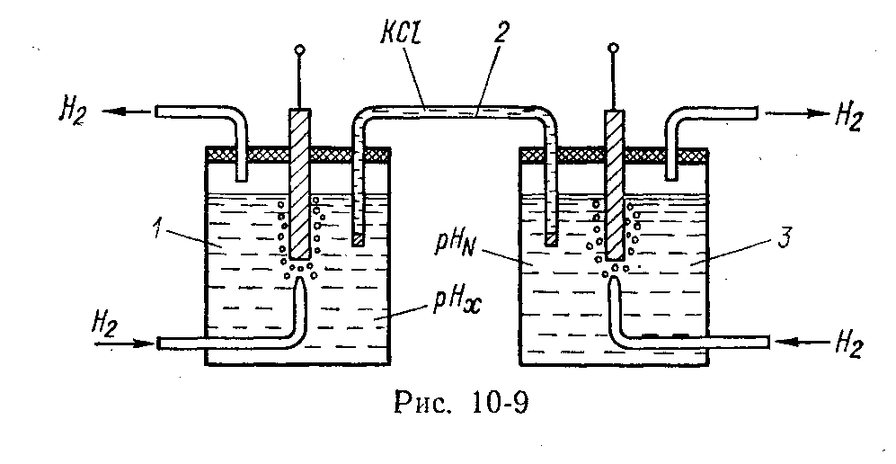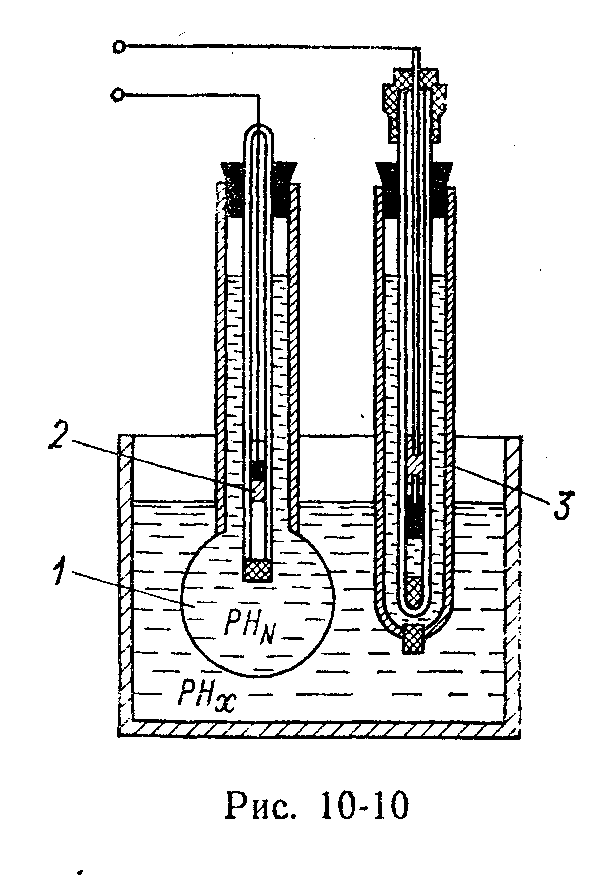 Большое значение имеет определение концентрации ионов водорода Н + в растворах. Чистая дистиллированная вода диссоциирована на ионы. Согласно закону действующих масс и вследствие малой диссоциации воды ионное произведение воды равно k=аH + + аOH –, где аH + и аOH ––концентрация ионов Н + и ОН – в моль/л. Ионное произведение воды – величина постоянная, при температуре 22°С равна 10–14. Если в воде растворить кислоту, то при диссоциации ее молекул концентрация ионов Н + возрастает и, следовательно, уменьшается концентрация ионов ОН –. Растворение оснований изменяет концентрации Н + и ОН – противоположным образом. Концентрация ионов водорода характеризует кислотность раствора. Кислотность влияет на протекание многих химических реакций и биохимических процессов. Единицей ее измерения служит водородный показатель: pH =–ln aН +. Приборы, служащие для измерения водородного показателя, называются рН-метрами. Их первичными преобразователями служат гальванические преобразователи, в которых роль металла играет водород, роль металлических ионов – ионы Н +. Типичным полуэлементом рН -метра является водородный электрод 1на рис. 5.91. Он представляет стеклянный сосуд с электролитом, в который погружена пластинка, покрытая мелкодисперсной платиной (платиновой чернью) 2. Снизу на пластинку подается газообразный водород. Он адсорбируется платиной и частично в виде ионов Н + переходит в раствор. Вследствие оставшихся на пластинке электронов она имеет отрицательный потенциал относительно раствора. Для измерения кислотности используют два полуэлемента. Один полуэлемент 1заполняется электролитом с известной концентрацией, другой 3 – электролитом, значение рН которого нужно измерить. Развиваемая между электродами разность потенциалов Е определяется выражением