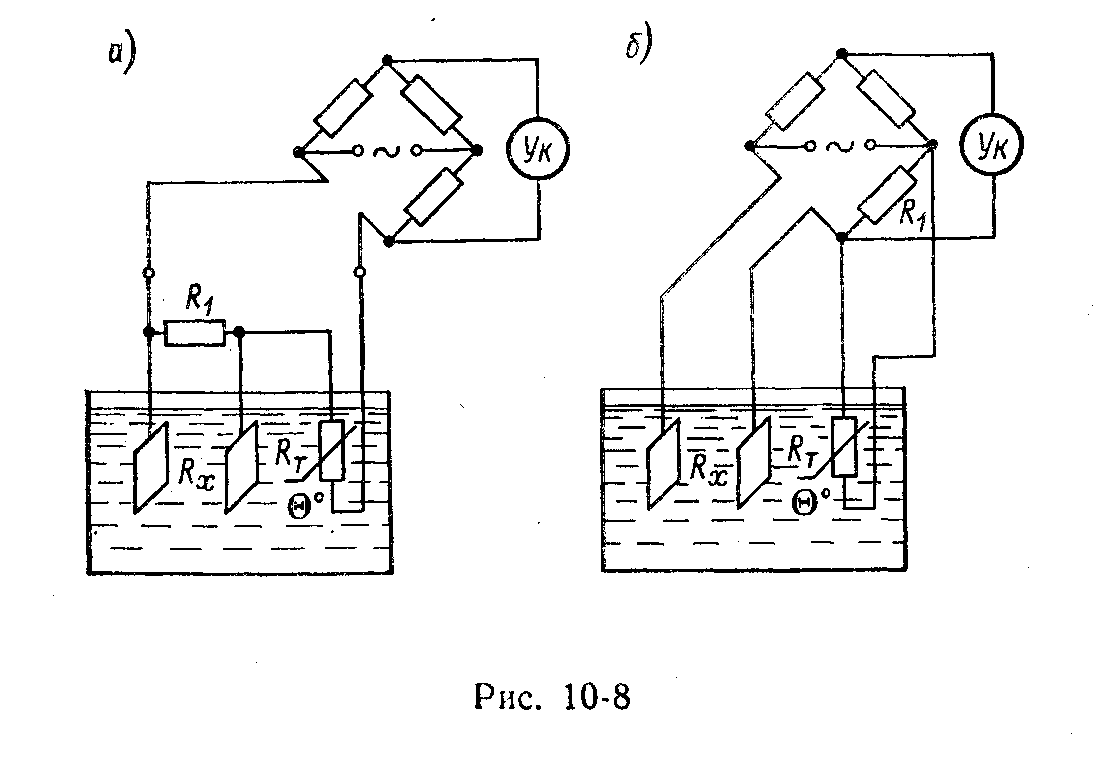 Коррекция температурной погрешности кондуктометрических преобразователей осуществляется в основном термостатированием раствора и измерительного преобразователя и цепями автоматической коррекции с использованием медных, никелевых, полупроводниковых и электролитических терморезисторов, помещаемых в контролируемый раствор вместе с измерительным преобразователем. На рис. 5.92 показаны схемы температурной коррекции с применением медного (рис. 5.92, а) и полупроводникового (рис. 5.92, б) терморезисторов. Медный терморезистор обычно соединяется последовательно с измерительным преобразователем Rх. Полупроводниковые и электролитические терморезисторы, которые имеют отрицательный ТКС, включаются в плечо моста, смежное с Rх. Для выравнивания ТКС терморезистора и раствора параллельно элементу цепи с большим ТКС включается резистор из манганина R 1.