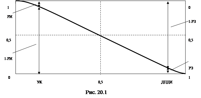 При разработке выборочного контроля необходимо установить число испытуемых изделий, продолжительность испытаний и приемочное число (ПЧ). Под ПЧ понимают наибольшее число дефектных изделий в выборке, при котором результаты испытаний можно считать положительными. Если число дефектных изделий больше чем ПЧ, результаты испытаний считают отрицательными. В последнем случае возможны два решения: продолжить контроль или забраковать всю партию, которая может быть подвергнута сплошной проверке или возвращена изготовителю (исполнителю). Вероятность приемки партии изделий, качество которых не соответствует установленному допустимому проценту дефектных изделий (ДПДИ), называют риском заказчика (РЗ) (рис. 20.1). По согласованию между заказчиком и изготовителем устанавливают приемлемый уровень качества (УК) изделий. Вероятность забракования партии изделий, качество которых соответствует УК, называют риском изготовителя (РИ). Каждому плану выборочного контроля соответствует определенная зависимость вероятности приемки от показателей качества. Оперативная характеристика справедлива только для определенного закона распределения погрешностей (например: гауссовского).