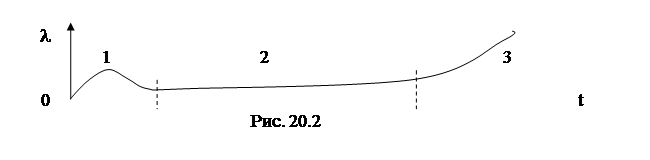 Объем и последовательность испытаний изделий определяется программой испытания и техническими требованиями на конкретное изделие. Основным требованием к изделиям, подвергаемым климатическим, механическим и электрическим испытаниям, является сохранение выходных (проверяемых) параметров после проведения испытания в пределах, установленных техническими условиями. Испытания проводят в камерах и на стендах, имитирующих воздействие различных климатических и механических факторов. Если нельзя воспроизвести полный комплекс условий эксплуатации, то испытания проводят в реальных условиях (натурные испытания). Изделия перед испытанием должны пройти контроль и этап приработки. Приработка уменьшает вероятность отказов, вызванных скрытыми дефектами производства. Приработка значительно удлинняет цикл изготовления, но повышает надежность продукции. Весьма важным является установление времени и режимов (тепловых и электрических) для выполнения этой операции. Продолжительность приработки целесообразно ограничить участком 1 кривой интенсивности отказов (рис.20.2).