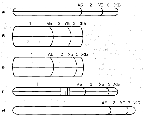 Р и с. 2. 3. Барьеры мышц: а — нормальная мышца; б — активная контрактура; в — пассивная контрактура; г — мышца с локальным гипертонусом; д — вялая (гипотонич- ная) мышца; 1 —объем активного барьера; 1 + 2 —объем упругого барьера; 1 + 2 + 3 — эбъем жесткого барьера.