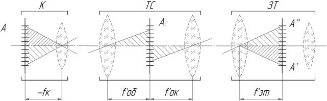 Схема состоит из коллиматора К, в фокусе которого находится тест-объект, телескопической системы ТС и зрительной трубы ЗТ (Рис.5.17). Визируя зрительную трубу без ТС, определяем число А' − число делений сетки ЗТ, соответствующее изображению определяемого размера А, вертикальной сетки коллиматора. Затем устанавливают ТС между коллиматором и зрительной трубой и определяют А'' − число делений, соответствующее изображению А., которое дает телескопическая система и зрительная труба. Угловое увеличение определится по формуле