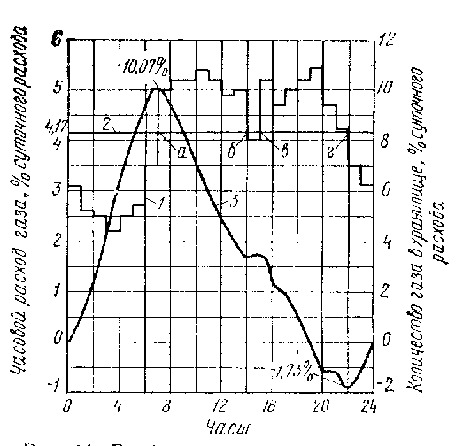 Методика количественного определения объема хранилищ для компенсации неравномерности потребления газа сводиться к следующему. График потребления газа за время T делится на n частей по времени (n = 24 - суточная неравномерность, n = 7 - недельная неравномерность). При известных величина подачах для каждого интервала вычисляет суммарное количество потребляемого газа и поступившего газа Qoi и Qni. Определяют разность, равную количеству газа, который должен находиться в хранилище для компенсации неравномерности: