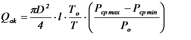 где D - диаметр газопровода, м; l - длина газопровода, м; Т - абсолютная температура газа, К; To = 273 К; Po = 0,101 МПа; Pcpmax и Pcpmin - среднее максимальное и минимальное давления в газопроводе, МПа, которые определяются по формулам