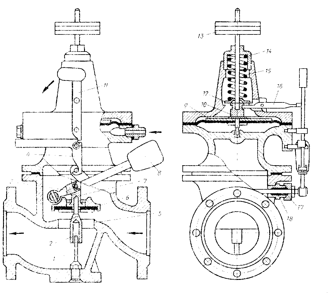 Рисунок 14.4 Предохранительный запорный клапан типа ПКН или ПКВ 1 - направляющая; 2 - фиксатор; 3 - вилка; 4 - предохранитель; 5 - седло; 6 - клапан; 7 - шток; 8 - подъемный рычаг; 9 - мембрана; 10 - шток; 11 - ударник; 12 - опорная шайба; 13 - груз; 14 - гайка; 15 - пружина; 16 - защелка; 17 - сальник; 18 - ось рычага.