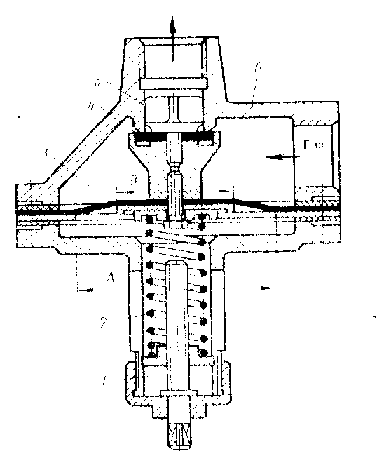 Рисунок 14.5 Предохранительный сбросной клапан типа ПСК 1 - регулировочный винт; 2 - пружина; 3 - мембрана; 4 - уплотнение; 5 - золотник; 6 - седло.