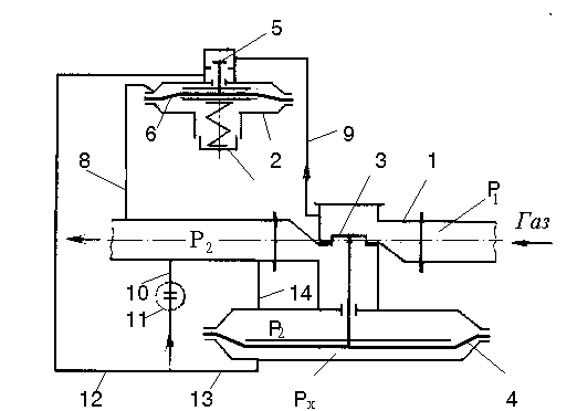 Рисунок 14.7 Схема регулятора давления 1 - исполнительный механизм; 2 - регулятор управления (пилот); 3, 4 - клапан и мембрана исполнительного механизма; 5,6 - клапан и мембрана регулятора управления; 7 - винт для настройки регулятора; 8 - импульсная трубка; 9 - трубка для подачи газа начального давления; 10 - трубка для сброса газа; 11 - дроссель; 12 - трубка, соединяющая пилот и дроссель; 13 - трубка, передающая конечное давление исполнительному механизму; 14 - трубка, соединяющая надмембранную зону исполнительного механизма с газопроводом после регулятора.