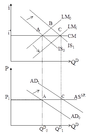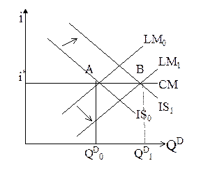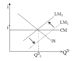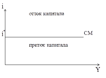В случае открытой экономики с полной мобильностью капитала важное значение приобретает кривая СМ, описываемая условие равенства внутренней процентной ставки мировой: i=i*. Эта кривая, по сути, заменяет LM, так как равновесие теперь будет определяться пересечением IS и LM, однако для наглядности стоит оставить все три кривые: