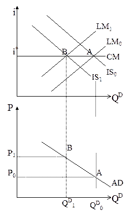 В открытой экономике можно таким же образом, как и в закрытой, вывести кривую совокупного спроса из кривых IS, LM, CM. Ниже приводится вывод в условиях фиксированного обменного курса и мобильности капитала, но то же самое можно проделать и при других предположениях.