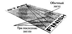 и объективных величинах новым понятием, где пространство и время неразрывно зависят от относительного движения наблюдателя и объекта наблюдения. Поняв, что движущиеся объекты сокращаются в направлении движения, мы могли бы на этом закончить обсуждение. Однако специальная теория относительности еще глубже объединяет все рассмотренные нами явления. Чтобы понять это, представим себе не очень практичный автомобиль, который быстро достигает фиксированной рекомендуемой скорости 160 км/ч и поддерживает ее, не ускоряясь и не замедляясь, пока не будет выключен двигатель, и он прокатится по инерции до остановки. Представим также, что растущая известность Слима как талантливого пилота привела к тому, что он получил предложение провести испытания этого автомобиля на длинной, прямой и широкой трассе, расположенной посреди плоской равнины в пустыне. Поскольку расстояние между стартом и финишем составляет 16 км, автомобиль должен покрыть это расстояние за одну десятую часть часа, т.е. за шесть минут. Просматривая результаты десятков испытательных заездов, Джим, подрабатывающий автомобильным инженером, столкнулся с тем, что хотя большинство результатов в точности равнялось шести минутам, несколько последних были существенно хуже: 6,5, 7 и даже 7,5 минут. Сначала он заподозрил наличие какой-то неисправности, поскольку такое время указывало на то, что в течение последних трех заездов автомобиль двигался медленнее, чем со скоростью 160 км/ч. Однако тщательное исследование автомобиля убедило его, что тот находится в превосходном состоянии. Не сумев понять причину таких необычных результатов, он обратился к Слиму, попросив его рассказать об этих последних заездах. Объяснение Слима оказалось простым. Он сказал Джиму, что поскольку трасса проходит с востока на запад, а заезды проходили в конце дня, Солнце било ему прямо в глаза. В течение последних трех заездов условия были столь плохими, что он отклонился от оси трассы на небольшой угол. Он нарисовал свой путь в ходе трех последних заездов, который показан на рис. 2.5. Причина появления трех последних результатов стала совершенно ясна: путь от линии старта до линии финиша при движении под углом к оси трассы будет больше, следовательно, при той же самой скорости в 160 км/ч он займет больше времени. Другими словами, при движении по пути, проходящему под углом, часть скорости в 160 км/ч уходит на движение в направлении с юга на север, в результате на то, чтобы пройти маршрут с востока на запад, останется меньше скорости. Поэтому, чтобы пройти трассу, требуется немного больше времени. Как уже отмечалось, объяснение Слима является простым и понятным. Однако оно заслуживает того, чтобы немного его перефразировать ради концептуального прорыва. Направления с севера на юг и с востока на запад представляют собой два независимых