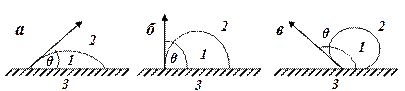 Это означает, что поверхность в этом случае лучше смачивается водой (жидкостью 1) и является гидрофильной (рис.2.4.8). Если θ > 90º, cosθ < 0 и