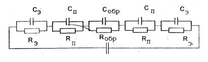 Рис. 2. Эквивалентная электрическая схема системы электрод-прокладка-образец-прокладка-электрод.