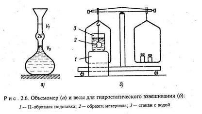 Насыщенный водой образец подвешивают на тонкой проволочке к коромыслу технических весов и еще раз определяют его массу ттс. Затем образец, не снимая с весов, погружают в воду, используя приспособление для гидростатического взвешивания (рис. 2.6, б) и определяют массу гирь, уравновешивающих образец, находящийся в воде — /явод. По результатам двух последних взвешиваний рассчитывают естественный объем образца