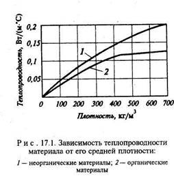 Строение теплоизоляционных материалов. Пористость. Основной признак теплоизоляционных материалов — высокое содержание воздуха в объеме материала. Причина этого в следующем. Газы по сравнению с жидкостями и твердыми телами обладают чрезвычайно низкой теплопроводностью (объясняется это удаленностью молекул газов друг от друга, что затрудняет передачу ими тепловой энергии). Так, теплопроводность воздуха X = 0,023 Вт/(м • К). Эта'цифра справедлива для переноса тепла воздухом в спокойном состоянии. Движение воздуха (в частности, конвекция) способствует намного более интенсивному теплообмену. Поэтому теплоизоляционный материал должен состоять в основном из воздуха, лишенного способности перемещаться. Это возможно в тех следующих случаях, когда материал имеет следующее строение: • мелкопористое ячеистое (как пена); • волокнистое (как вата); • зернистое (воздух находится в межзерновом пространстве); • пластинчатое (воздушные прослойки заключены между листками материала). Наибольшее содержание воздуха, т. е. максимальная пористость, возможна у первых двух типов материалов. У материала ячеистого строения (например, пенопласта) пористость может достигать 95...98 %, а у волокнистых материалов (например, минеральной ваты) — 90...95 %. Возможны материалы со структурой смешанного типа. Например, у керамзита два типа воздушных пустот: межзерновая пустотность — 45...50 % и пористость самих зерен — 65...70 %, что в общем дает содержание воздуха в материале — 75...80 %. Строение вещества твердого каркаса материала также влияет на его теплопроводность. Если вещество имеет кристаллическое строение, то его атомы расположены в правильном порядке; это предопределяет его высокую теплопроводность. Вещества, имеющие стеклообразное строение, не имеют такого порядка в расположении атомов. Поэтому одно и то же вещество в стеклообразном состоянии имеет в несколько раз меньшую теплопроводность, чем в кристаллическом (например, кристалл кварца имеет X = 7,2 (13,6) Вт/(м ■ К) (в зависимости от направления), а кварцевое стекло — около 0,7 Вт/(м • К). У большинства неорганических теплоизоляционных материалов вещество, образующее каркас, имеет стеклообразное строение (минеральная вата, пеностекло и др.). Существенно влияет на теплопроводность и однородность строения материала. Так, песчаник, состоящий из отдельных кристаллов кварца (песчинок), скрепленных природным цементом, имеет X = 2...3 Вт/(м ■ К), т. е. в 3...4 раза ниже отдельного кристалла кварца. Средняя плотность материала зависит в основном от его пористости (см. § 2.3). В то же время пористость является главным фактором, от которого зависит теплопроводность материала. Поэтому в определенных пределах с достаточной степенью точности связь между плотностью и теплопроводностью можно считать линейной (рис. 17.1). Чем ниже средняя плотность материала, тем больше в нем пор и тем ниже его теплопроводность. Поэтому для характеристики теплопроводности (X) можно использовать среднюю плотность материала рт- Установлены следующие марки теплоизоляционных материалов (кг/м3): D15, D25, D35, D50, D75, D100, D125, D150, D200, D250, D300, D350, D400, D500, D600. О целесообразности установления марки теплоизоляционных материалов по плотности говорит простота расчета плотности по сравнению с определением теплопроводности. Влажность оказывает существенное влияние на теплопроводн
