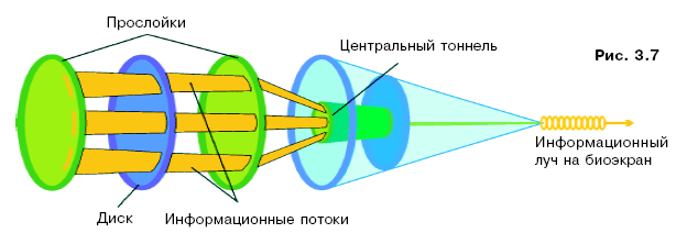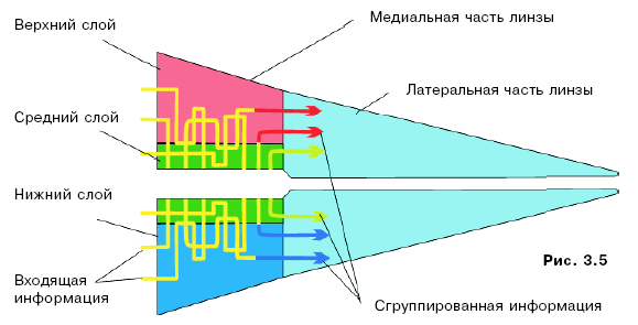 В результате из окончания второй половины линзы выходят три луча: центральный и два боковых. Центральный луч движется к биоэкрану. Два боковых огибают зрительный перекрёсток и соединяются. При этом они оказывают влияние на информацию, идущую через зрительный перекрёсток, «выбивая» наиболее значимую, тем самым выполняя роль тонкого фильтра.