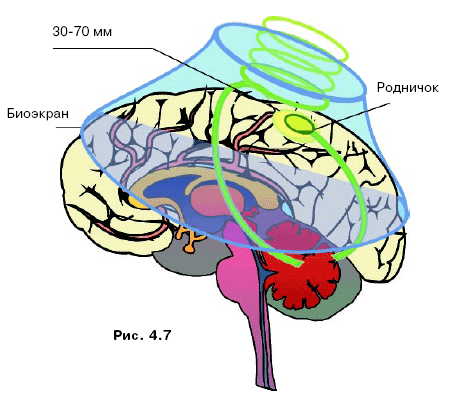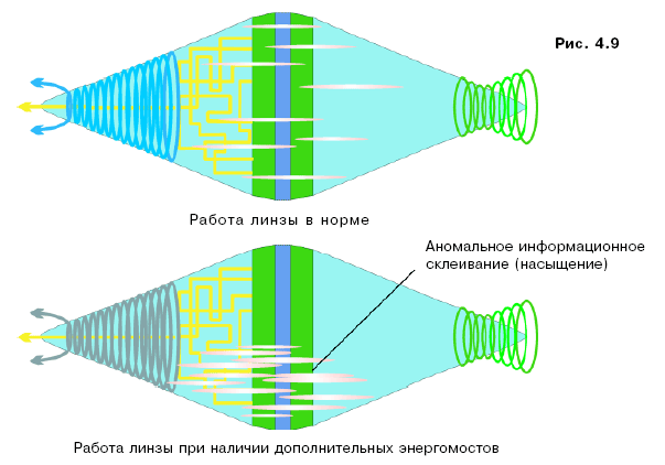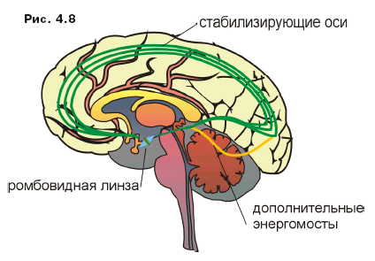 При блокировке энергетического воздействия на головной мозг, приводящего к невосприимчивости зрительной и слуховой информации, происходит следующий процесс. Он не привязан к определённым ситуациям, и запускающая его информация может быть достаточно случайной. Существует общий принцип. Поступающая высокоэнергетичная информация создаёт очень мощную и стойкую волну, распространяющуюся по путям её следования. Проходя через ромбовидную линзу и попадая на стабилизирующие оси больших полушарий, она вызывает кратковременный эффект (нечто подобное возникает при шизофрении). Происходит образование энергетических «пробок» на зрительных, слуховых или двигательных путях. Имеется также механизм экстренного включения желез внутренней секреции. При попадании высокоэнергетичной информации на центры, регулирующие деятельность желез внутренней секреции, происходит выброс группы гормонов, по действию близких к адреналину. Они вызывают резкий спазм сосудов головного мозга, приводящий к гипоксии, что может сопровождаться обморочным состоянием. Возможно также погашение стрессовой ситуации. Существует целый комплекс защитных механизмов энергетического, морфологического и физиологического уровней, таких, например, как энергетическое восполнение через чакровые структуры и срабатывание биоэкранных механизмов, помогающих погасить стрессовую ситуацию. Психический «маятник» человека устроен природой так, что в большинстве случаев самостоятельно возвращает психику в состояние равновесия. Между стабилизирующими осями больших полушарий и мозжечковыми структурами могут образовываться своеобразные энергомосты. По форме они напоминают серп, возникающий между нисходящими участками стабилизирующих осей и ножками мозжечка, захватывая его перешеечную область с программами. Другие концы этих энергомостов соединяются с ромбовидной линзой, блокируя её нижнюю половину, что ведёт к односторонней обработке и усвоению информации (рис. 4.8). Дополнительные энергомосты могут способствовать возникновению некоторых патологических психических процессов. Большое значение имеет, какие именно стабилизирующие оси замыкаются на мозжечок. Если это 3-я или 4-я оси, наблюдаются отклонения интеллектуального характера, не доходящие, впрочем, до маний – преследования, величия и т.д. Информационно-энергетические нити в нижней половине ромбовидной линзы как бы «склеиваются», по 2–3 нити вместе, что препятствует качественной обработке информации, поэтому многие фрагменты не анализируются (рис. 4.9).