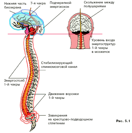 Данный энергетический центр представляет собой очень узкую вытянутую воронку, раструб которой находится в крестцовом отделе. Нижнее кольцо этой воронки, если смотреть снизу, вращается по часовой стрелке. Вихревое вращение поля узкой части воронки наблюдается в районе ствола головного мозга, проникая в биоэкран в виде прямых осевых линий. На уровне мозжечка 1-я чакра представляет собой не сплошное образование и не вытянутую спираль из нескольких осей, а нечто среднее. Скорость её вращения - приблизительно один оборот в секунду (рис. 5.1). Позвоночник и воронку 1-й чакры охватывает полевое образование - энергостолб. Он берёт своё начало от линзы 7-й чакры и заканчивается на крестцово-подвздошном нервном сплетении. Вся информация, проходящая по этой энергетической структуре, контролируется мозжечком. Первая чакра имеет достаточно высокую энергетическую насыщенность за счёт своего вращения и, как правило, не воспринимает кодированное воздействие. Этот канал может проводить только ярко выраженные элементы высокоэнергетичной кодированной информации. Приведём типичные отклонения, характерные для этого энергетического центра. 1. Спираль 1-й чакры может замедлять своё вращение. За счёт этого определённая негативная информация проникает через её канал, не подвергаясь анализу на мозжечковых структурах. В норме замедление вращения воронки на одну четверть происходит во время сна, независимо от его стадии. Оно начинается, когда обрабатываемая мозгом информация приобретает выраженный кредовый характер, а энергетика мозговых структур не позволяет восстановить скорость вращения воронки до нормы. Физиологично, если замедление продолжается 2-3 часа, чего вполне достаточно для полного восстановления её защитных функций. Процесс связан, в основном, не с отдыхом, а с отключением чакровых структур от спинномозгового канала. Если они не отключаются, то энергоканал будет загружен чакровыми энергетическими поступлениями извне.