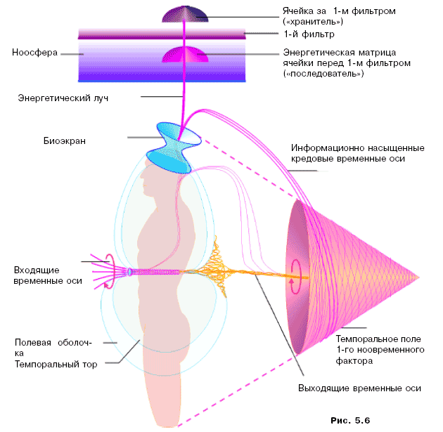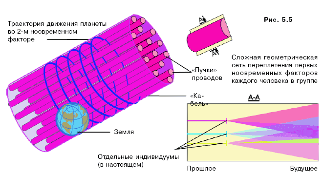 Первый поток состоит из небольшого количества временных осей. Он отклоняется вверх и пронизывает программные структуры мозжечка и биоэкран. Выбор осей индивидуален для каждого человека. Второй поток временных осей проходит тело человека насквозь, закручиваясь по часовой стрелке. Это неиспользованные оси, или потенциальные возможности индивида. Точка приложения отклоняющего фактора находится в диске 3-й чакры и обусловлена энергетикой организма, так как кредовые установки отражаются на всей структуре поля человека. По своей геометрии первый поток осей в целом повторяет структуру 2-й чакры, но не закручен спиралевидно. Он избирательно отклоняется от основного пучка согласно жизненному кредо, точнее - двум-трём его поведенческим линиям, которые диктует первое кольцо биоэкрана. Временные составляющие осей создают темпоральное поле, выходящее из района диска 3-й чакры и охватывающее туловище человека. Оно образует эллипсовидный тор, окутывающий сверху район мозжечка, а снизу - основание 1-й чакры (рис 5.4). Временные оси - это не энергетическая система организма или резонансные зоны иных энергетических формирований, а собственно энергетическая структура физического времени. Для того, чтобы более наглядно представить первый ноовременной фактор, рассмотрим некоторые элементы второго ноовременного фактора (рис. 5.5). Оси второго ноовременного фактора пронизывают Землю насквозь: можно сказать, что наша планета существует в его потоке. Это нечто аморфное, занимающее всё сечение поперечного среза орбиты Земли. Осевые линии временного фактора всегда содержат энергетическую составляющую, что делает возможным их взаимодействие с 3-й чакрой. Временные составляющие как первого, так и второго факторов растворены в этих структурах. Существуют более "осязаемые", т.н. постоянные оси 2-го ноовременного фактора, и их можно сравнить с пучком проводов в многожильном кабеле. При этом ноосферные структуры расположены по периметру этого "кабеля", а "пучки проводов" состоят из первых ноовременных факторов отдельных людей. Эти люди объединены в группы по информационной составляющей генокода, не связанной с расовой принадлежностью. Она включает в себя: