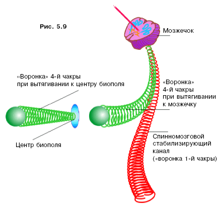 2. Возникает обратная связь биопольного центра с наибольшим кольцом вытянутой спирали 4-й чакры за счёт объёмного наведённого поля. При этом образуется шар с диаметром, равным этому витку, но более энергоёмкий и имеющий параметры биопольного центра. Это служит дополнительным стимулом для чакры. 3. При достаточно крупных повреждениях запускается механизм, изменяющий работу 3-й чакры. Существуют два пути его работы: через биоэкран и оболочку или за счёт образования вихревых полей в организме, создающих противоток движению временных осей. При этом воздействие оказывается на входные каналы 3-й чакры. Оно приводит к последующему перераспределению временных осей на входе. 4. Энергококон головного мозга также может участвовать в этих процессах, реагируя на изменения кровотока. Он запускает механизмы, действующие аналогично 3-й чакре, но с участием арсенальных, биоэкранных и мозжечковых структур.