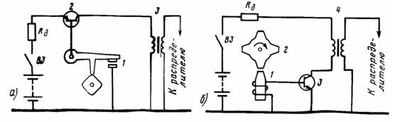 С увеличением частоты вращения коленчатого вала двигателя уменьшается время замкнутого состояния контактов прерывателя, что приводит к уменьшению силы тока первичной цепи в момент размыкания контактов и, следовательно, вторичного напряжения. Такая же закономерность наблюдается с увеличением числа цилиндров. Чтобы обеспечить высокое вторичное напряжение для высокооборотистых двигателей с большим числом цилиндров, необходимо увеличивать силу первичного тока. Однако при увеличении силы тока разрыва более 3,5А возникает сильное искрение на контактах прерывателя, что приводит к уменьшению их срока службы и снижению надежности системы зажигания. Указанные недостатки классической системы зажигания исключаются применением контактно-транзисторной системы зажигания. Основной особенностью такой системы (рис. 6.2, а) является то, что через контакты прерывателя проходит небольшой по силе ток управления транзистором. Ток первичной обмотки при этом прерывается не контактами прерывателя, а переходом эмиттер-коллектор транзистора. Так как транзистор разгружает контакты прерывателя, отпадает необходимость в искрогасящем конденсаторе. Работает схема следующим образом. При замыкании контактов 1 прерывателя база транзистора 2 через корпус соединяется с отрицательным выводом аккумуляторной батареи. По цепи базы пойдет ток, и транзистор откроется. Открытый транзистор замкнет цепь первичной обмотки катушки зажигания 3 и по ней пойдет ток. При размыкании контактов прерывателя транзистор закроется, разрывая цепь обмотки катушки зажигания. При этом во вторичной обмотке будет индуктироваться э.д.с. большей величины. Посредством распределителя высокое напряжение подается на электроды свечи, происходит пробой искрового промежутка и воспламенение смеси. В реальной схеме контактно-транзисторной системы зажигания для коммутации первичной цепи применяется транзисторный коммутатор, в котором, кроме транзистора, имеется ряд элементов. Они служат для защиты транзистора от перенапряжений и улучшения условий его переключения. Контактно-транзисторная система зажигания, исключая износ контактов, не позволяет избежать другого вредного эффекта, присущего классической системе зажигания. Этот эффект характеризуется дребезгом контактов, который возникает при необходимости подачи высокого напряжения с высокой частотой. При этом дребезг контактов приводит к уменьшению вторичного напряжения. Так, для многоцилиндровых высокооборотных двигателей внутреннего сгорания требуется такая частота искрообразования на свечах, которая при применении контактного прерывателя может быть достигнута при применении двух независимых систем зажигания (двойные прерыватели, две катушки зажигания и т.д.). Применение бесконтактных систем зажигания позволяет получить стабильное искрообразование на свечах и при высоких частотах вращения коленчатого вала. Бесконтактный датчик системы зажигания не подвержен механическим износам, что свойственно контактным узлам ввиду наличия трущихся частей. Поэтому момент зажигания с увеличением пробега в бесконтактной системе не меняется, и она не требует обслуживания. Основной особенностью бесконтактной системы зажигания является тип и конструкция его датчика. Магнитоэлектрический датчик (рис. 6.2, б) содержит п