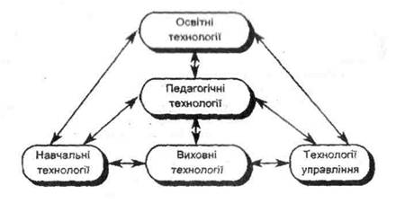 Рис.6. Ієрархія і взаємозв'язок понять «технологія» в педагогіці. Освітні технології відбивають загальну стратегію розвитку освіти, єдиного освітнього простору, їх призначення - прогнозування розвитку освіти, його конкретне проектування і планування, передбачення результатів, а також визначення відповідних освітнім цілям стандартів. Прикладами освітніх технологій можуть бути концепції освіти, освітні системи. На сучасному етапі - це гуманістична концепція освіти. Якщо освітні технології відбивають стратегію освіти, то педагогічні втілюють тактику її реалізації (за Т.Назаровою) у навчально-виховному процесі шляхом впровадження моделей останнього і тотожних йому моделей управління цим процесом. Наприклад, модель особистісно орієнтованого розвивального навчання, мо-дульно-розвивального навчання, проблемного навчання та інші. Отже, можна зробити висновок, що педагогічна технологія відображає модель навчально-виховного і управлінського процесів освітнього закладу і об'єднує в собі зміст, форми і засоби кожного з них. Навчальна технологія - поняття близьке, але не тотожне поняттю педагогічна технологія. Воно підбиває шлях освоєння конкретного навчального матеріалу (поняття) в межах відповідного навчального предмета, теми, питання. Потребує спеціальної організації навчального змісту, адекватних йому форм і методів навчання. Але можливі й такі варіанти: до форм навчання добираються зміст і методи навчання або до методів - форми і структурується зміст навчання. Наприклад, це можуть бути предметне навчання, ігрова технологія, технологія проблемного навчання (на рівні методу), інформаційні технології, технологія використання опорних схем, конспектів, класично лекційне навчання, навчання за допомогою аудіовізуальних технічних засобів чи книжки, система «консультант», система «репетитор» (індивідуальне), дистанційне навчання, комп'ютерне навчання та ін. Слід зазначити, що технології навчання, виховання, управління пов'язані з педагогічними технологіями, освітніми технологіями загальною ідеєю відповідної освітньої концепції, педагогічними парадигмами, змістовим наповненням функцій. Педагогічна техніка відбиває рівень майстерності педагога. Від того, як і якими прийомами навчання й виховання він володіє, залежить ступінь розвитку суб'єктів навчання (виховання). Це означає, що поняття педагогічна техніка, безумовно, пов'язане з поняттями навчальна (виховна) технологія, педагогічна технологія, освітня технологія. Змістовий взаємозв'язок розглянутих понять можна показати схематично (Рис.7).