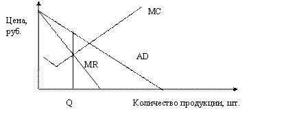Как показано на рис. 25, кривая предельного дохода (MR) является более крутой, чем линия спроса фирмы– монополиста (AD). По мере роста продукции фирма должна выбрать оптимальное соотношение цены и объема продукции. Оптимум будет там, где предельные издержки пересекают линию предельного дохода фирмы–монополиста. В этой точке эффективность производства будет наивысшей, потенциал ресурсов фирмы–монополиста будет полностью использован (см. рис. 26).