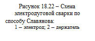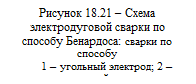 Сварка металлов. Сварка представляет собой технологический процесс получения механически неразъемных соединений металлических изделий путем местного нагрева до плавления или до пластического состояния. С применением сварки изготавливают строительные металлоконструкции для мостов, гидротехнических сооружений, промышленных зданий и сооружений и др. В зависимости от источника получения тепла, степени нагрева свариваемых деталей и технологии ведения процесса сварки ее подразделяют на следующие виды: электрическую (электродуговая, электроконтактная); химическую (газовая, термитная); электрохимическую (атомно-водородная); электромеханическую (кузнечная, давлением); лучевую (лазерная). В строительстве чаще всего применяют ручную электродуговую, газовую и электроконтактную виды сварки. При электродуговой сварке (рисунки 18.21,18.22 для местного плавления свариваемых деталей используют тепловой эффект электрической дуги,
