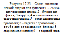 При первом способе в качестве присадочного материала используется металлическая проволока, которая смешивается с основным материалом и образует сварочный шов. Температура дуги составляет 3800–3900 °С. Этот способ применяется при сварке тонколистовой углеродистой конструкционной стали, некоторых цветных металлов и их сплавов.При втором способе электродом является металлический стержень и он же служит присадочным материалом. Для защиты наплавленного металла от вредного воздействия кислорода и азота воздуха электроды защищаются различными покрытиями. Наиболее простым является смесь жидкого стекла и мела. Сварка осуществляется на переменном и постоянном токе. Температура дуги при металлическом электроде составляет 2400–2600 °С. Этот способ является основным в строительстве. В настоящее время широко применяется автоматическая сварка под слоем флюса (рисунок 18.23). Состав флюса: 43–48 % МnО, 38–43 % SiO2, 9–10 % CaF2. Скорость сварки составляет 10–70 м/ч, производительность труда по сравнению с ручной повышается в 5–10 раз, улучшается качество шва. При электроконтактной сварке к соединяемым изделиям прикладываются механические усилия и пропускается электрический ток напряжением 0,5–10 В. Выделяется большое количество тепла, которое разогревает изделия и происходит сварка.