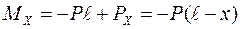 Построим эпюру изгибающих моментов. Для этого выбираем нулевую линию, параллельную оси балки. Откладывая в некотором масштабе Мм от этой линий вниз (МХ<0) под соответствующими сечениями балки найденные значения МХ получаем искомую эпюру (рисунок 3.6, б). Так как зависимость МХ от координаты сечения в данном случае является линейной, то эпюра изгибающих моментов представляет собой наклонную прямую. Абсолютная величина изгибающего момента достигает наибольшего значения у закрепленного конца балки. Рассмотренную задачу можно решить проще, если за начало отсчета координаты сечения принять точку преломления силы Р и определять главный момент сил, находящихся справа от сечения. Обозначив новую координату через Х1, имеем